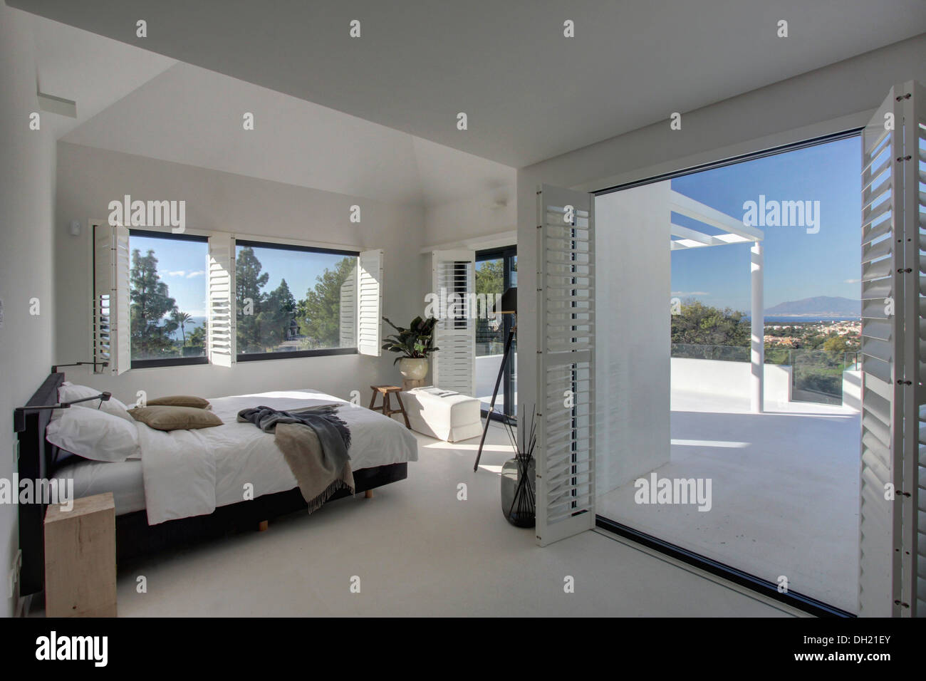 Moderne Weisse Schlafzimmer Mit Louvre Fensterladen Auf Offene Turen Zur Terrasse In Spanischen Villa Stockfotografie Alamy