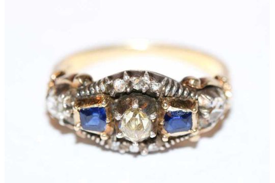 14 K Gelb Und Weissgold Ring Mit Diamanten Und Blauem Farbstein Ausgefallene Handarbeit Um 1900