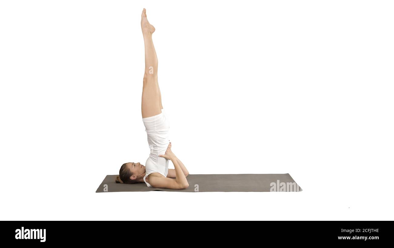 Frau Die Yoga Praktiziert Steht In Salamba Sarvangasana Ubung Unterstutzt Schulter Stehen Pose Auf Weissem Hintergrund Stockfotografie Alamy