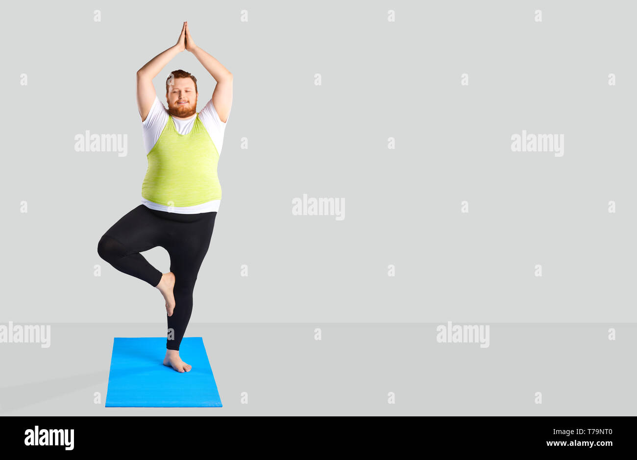 Funny Fat Man Yoga Ubungen Stehen Auf Einem Grauen Hintergrund Stockfotografie Alamy